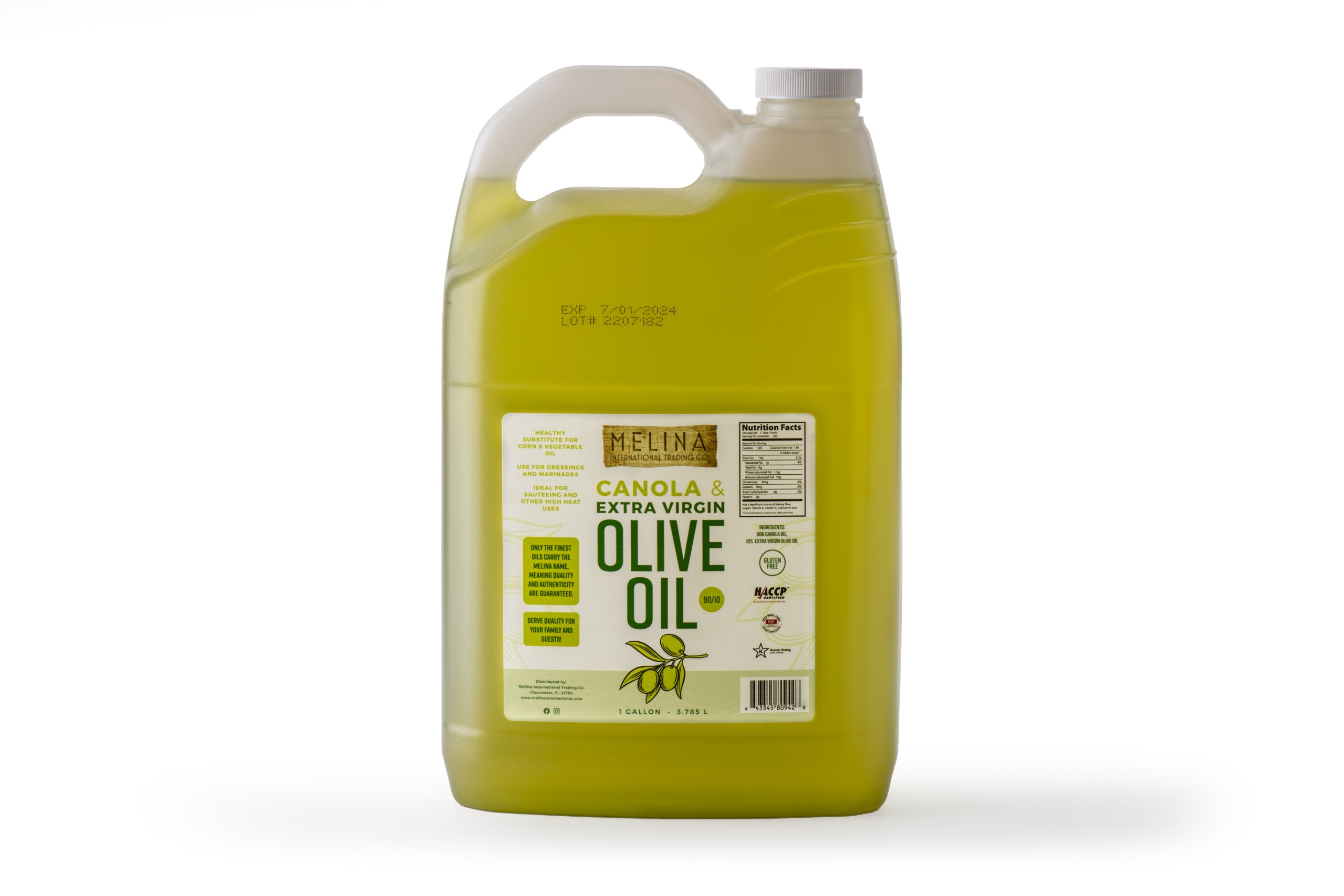 Get one of the best healthy alternative oils for frying! Our blend of canola oil and extra virgin olive oil gives you a light olive oil smell with rich flavor. The best way to use Melina International 90/10 blend is to whisk into marinades or on top of salads. This oil has a crisper taste than pomace oil. Our oil smokes less, so it’s easier for new cookers in the kitchen. This is a healthy alternative to other oils and has a pale green color to it, making it peppery tasting.